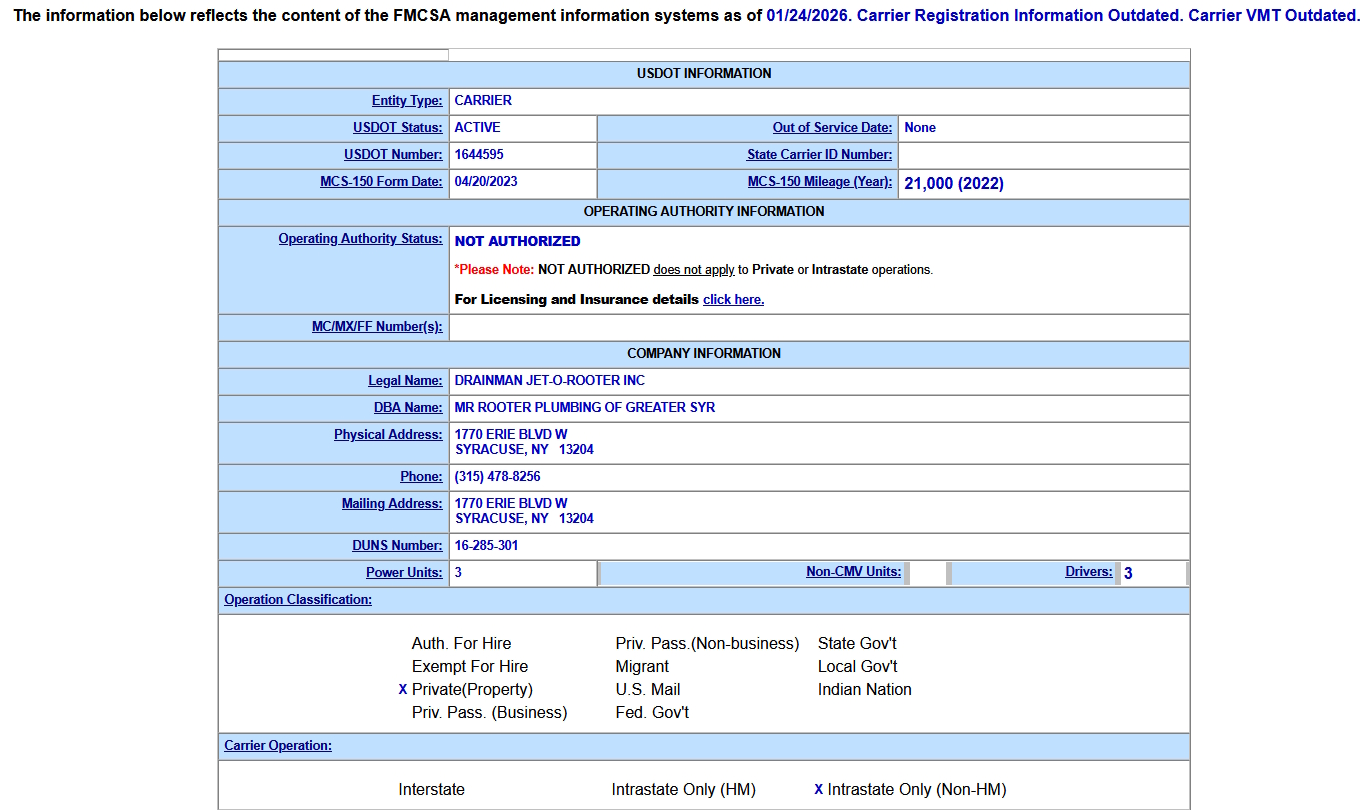 Davis Property Maintenance Labeled Truck Operating USDOT1644595 Legal Name: Drainman Jet-O-Rooter Inc