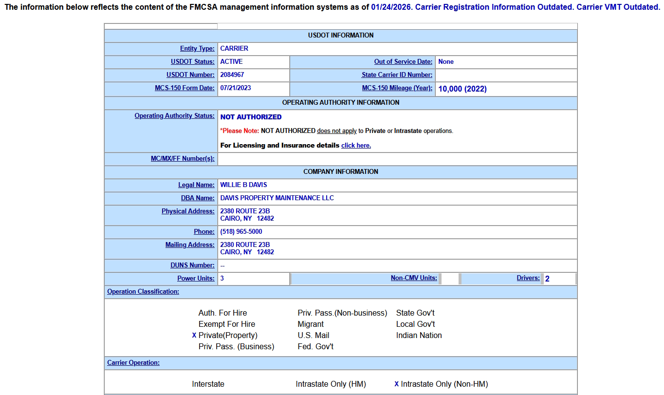 Davis Property Maintenance Vehicle DOT Records As Of 01/25/2026